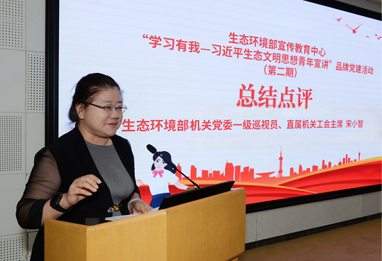 宋小智在总结点评中对本次青年宣讲活动予以充分肯定。她认为,宣教中心举办的品牌党建活动形式活泼、有特色、有创意,展示出了宣教中心青年的蓬勃朝气和工作特点。宣教中心党委专门为青年谋划搭建学习交流平台,充分表明了宣教中心党委对青年工作的高度重视和对青年同志的关心支持。希望宣教中心将活动坚持下去,不断总结提升,把“品牌”擦得更亮,让青年们得到更多成长锻炼。她也勉励宣教中心青年要继续深入学习贯彻党的二十大精神和习近平生态文明思想,深刻领会习近平总书记同团中央新一届领导班子成员集体谈话精神,立足岗位、苦练本领、创先争优,用生态环保铁军的要求锤炼自身能力品格,为全面推进美丽中国建设,加快推进人与自然和谐共生的现代化贡献青年的智慧和力量。